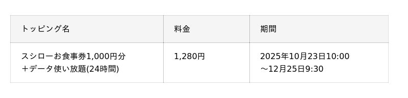 KDDI、沖縄セルラーは2025年10月23日から、povo2.0の「コラボトッピング」として、「スシローお食事券1,000円分」と「データ使い放題(24時間)」(注1)がセットになったトッピングを1,280円で提供します。データ購入とあわせて、スシローでのお食事もおトクにご利用いただけます。