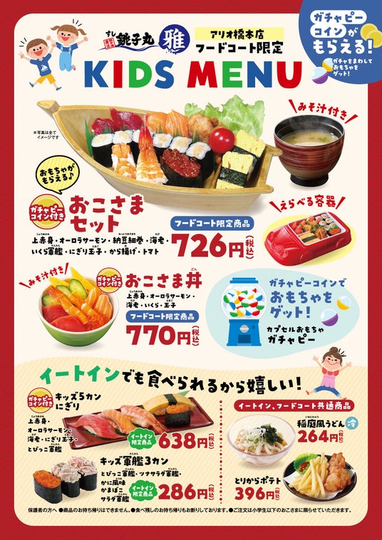 店内でもフードコートでも楽しめる定番の「おこさまセット」に加え、アリオ橋本店限定の「おこさま丼」など、人気のキッズメニューが新しくなりました。お食事と一緒にワクワクが詰まった「カプセルおもちゃ」もプレゼント!