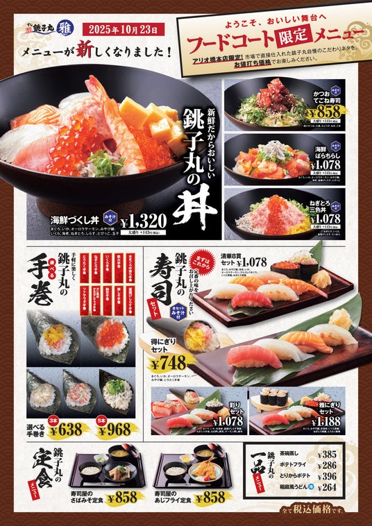 株式会社銚子丸(本社:千葉県千葉市美浜区 代表取締役:石井 憲)は、2025年10月23日(木)より、神奈川県相模原市のアリオ橋本店1Fにある「すし銚子丸 雅 アリオ橋本店」にて、グランドメニューをリニューアルいたします。