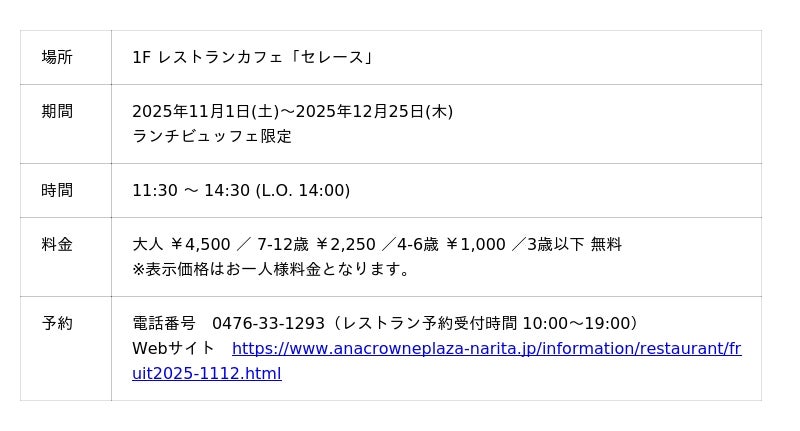 ANAクラウンプラザホテル成田(成田市堀之内 総支配人 ダヴィデ・ザナルディ)では、11月1日(土)から12月25日(木)のランチビュッフェ限定イベントとして、全国一位の生産量を誇る山形県産の山形ラ・フランス食べ放題「ラ・フランス・フェスタ」を 1F レストランカフェ「セレース」にて開催いたします。