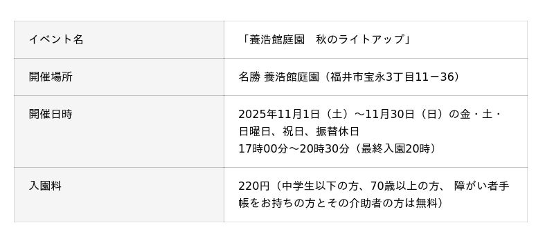 福井駅から程近くにある旧福井藩主松平家別邸・国名勝「養浩館庭園」で11月限定の「秋のライトアップ」を開催します。この時期にしか鑑賞できない特別な演出で、来園者の満足度向上へつなげます。