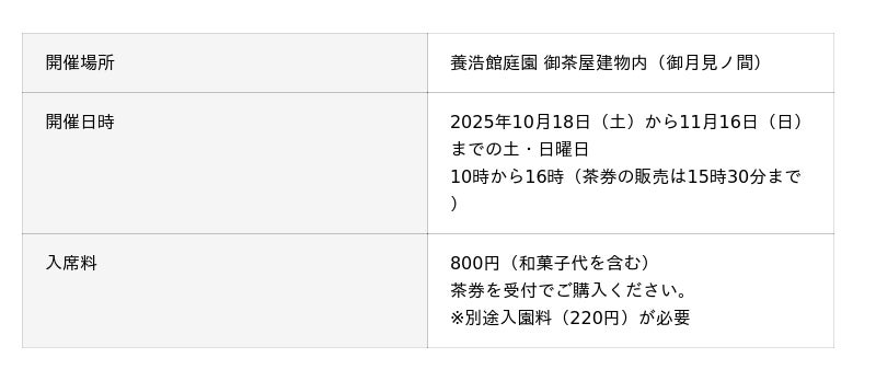 秋のライトアップ開催期間中にほかにも、お楽しみいただけるイベント等の情報をお伝えします!・秋のお茶席
