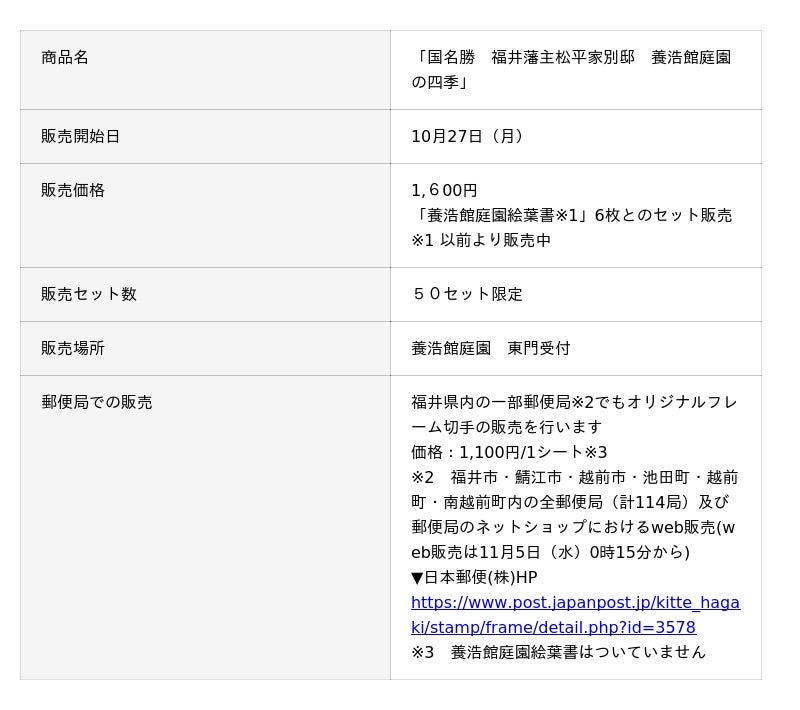 今秋のライトアップにあわせ、養浩館庭園の四季をテーマに日本郵便(株)が制作を行いました。2025年10月27日(月)~販売を開始します。養浩館庭園の思い出を持ち帰る素敵な記念品とされてはいかがでしょうか。