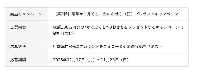 株式会社甲羅(本社:愛知県豊橋市、代表取締役社長:沼澤 裕)が、全国39店舗で展開するかに料理専門店「甲羅本店」は、今年のかに漁解禁を祝し、「新 “旬” 感謝祭」を10月23日(木)より実施します。かに漁解禁で水揚げされる初がにのご提供や、旬を楽しむ期間限定メニューなど、様々なフェアを開催します。また、フェアに合わせた豪華キャンペーンも実施します。
