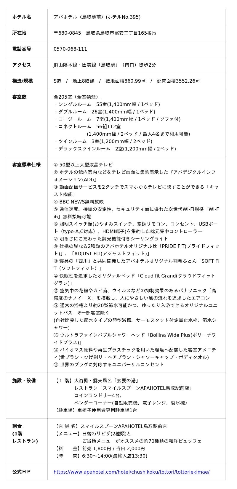 アパホテル〈鳥取駅前〉公式HP:https://www.apahotel.com/hotel/chushikoku/tottori/tottoriekimae/