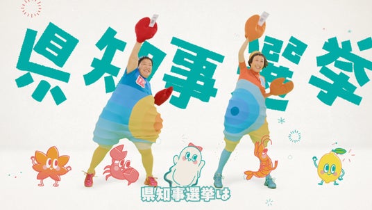 広島県選挙管理委員会(以下、広島県)では、11月9日(日)執行の広島県知事選挙に向け、子育て世代・若年層を中心に幅広い年代の方の投票を促すため、広島ゆかりのミュージックユニット:ケロポンズを起用したPRを展開しています。カニの姿の平田明子(=ポン)さんは広島県三次市出身。投票日の語呂合わせにもなっている「ひとりひとり(1・1)の声届く(9)!」をキャッチコピーに、YouTubeの再生回数が1.7億回を超える人気楽曲『エビカニクス』の替え歌にあわせて広島県知事選挙をPRしています。