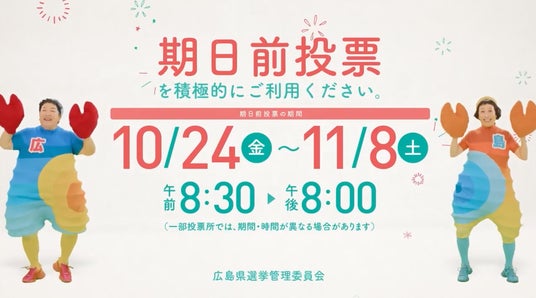 広島県選挙管理委員会では、11月9日(日)執行の広島県知事選挙に向け、動画やポスターで投票を呼びかけています。
