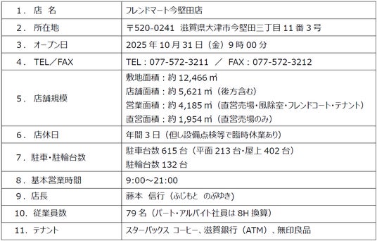 株式会社平和堂(滋賀県彦根市、代表取締役社長執行役員CEO:平松正嗣、以下「平和堂」)は、2025年10月31日(金)あさ9時00分、滋賀県大津市にフレンドマート今堅田店(以下「当店」)をオープンします。当店のオープンにより滋賀県内は82店舗、平和堂は全167店舗となります。