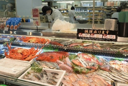 ■鮮度感と活気にあふれた売場その季節におすすめの旬の魚を姿魚、切身、刺身などをバリエーション豊富に展開します。銀だらなどこだわりの魚の西京漬けから、地域で親しまれている湖魚佃煮まで幅広い品揃えを実現しました。また、滋賀県内で栽培された新鮮な農産物を集めた地場農産物コーナーや、華やかな季節の切り花や鉢植えを集めた「ハナミライ」コーナーがお客様をお出迎えします。