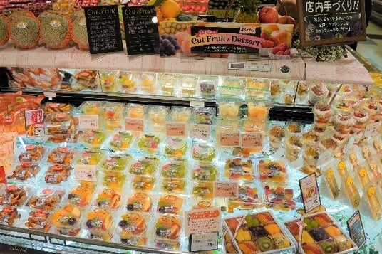子育て層からシニア、単身世帯が多いエリア特徴に合わせて、カットフルーツやお肉惣菜、寿司、手軽な冷凍食品を豊富に揃えます。精肉のジャンボパックを揃える一方、野菜や果物のばら売りなど、適量販売を行います。