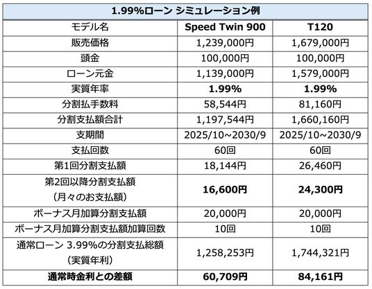 内容:キャンペーン期間中、全国のトライアンフ正規販売店にて対象車両をご成約、且つローン契約を完了していただいたお客様に、「0.99% 特別金利ローン」をご提供します。
