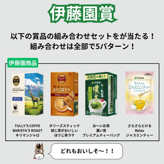 お~いお茶をはじめ健康ミネラル麦茶など伊藤園商品7種類の中から、お好きな飲料水を1本