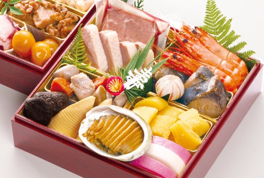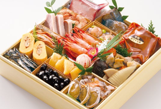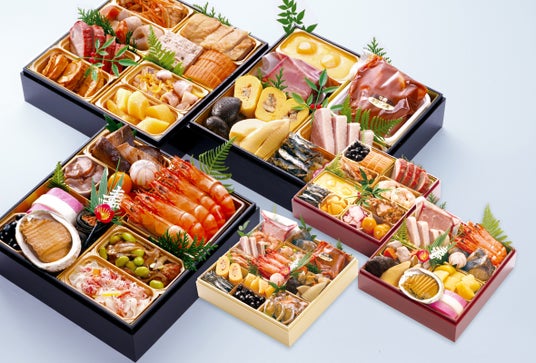 広東風チャーシュー、丹波黒豆煮、栗きんとん、海老のオーロラソース、伊達巻、鶏肉とくるみのオイスターソース、わかさぎ南蛮漬、田作り、柚子甘露煮、たこ梅酢、きんかんみつ煮