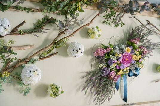 ヘッドボードは、北海道の花々に加え、バラやガーベラ、リボンで装飾したメインアレンジメントを中心に、森の中に佇むシマエナガをイメージし装飾。シマエナガはスズランなどで手作りされており、一つひとつ表情が異なる温かみを感じていただけます。さらに、天井にはフラワーボールとツタを吊るし、寝転びながら森の中を見上げるような、自然に包まれる空間を演出しています。