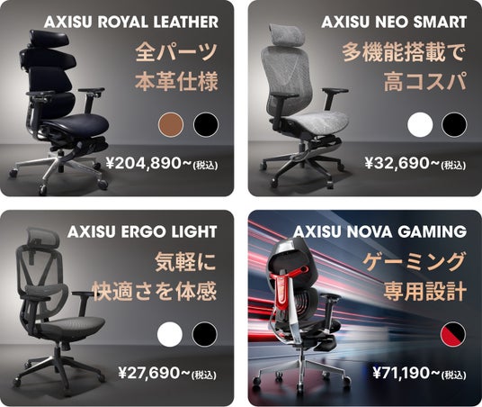 今回のアンバサダー就任を記念し、AXISUシリーズ第一弾となる「エルゴノミクスチェア」各モデルを、2025年10月より、先着100台限定で20%OFF にて特別販売しております。ぜひこの機会に、本田氏が認めたAXISUシリーズの快適な座り心地をご体感ください。