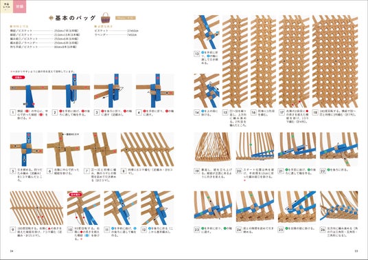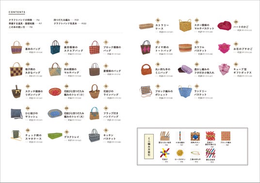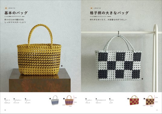 本書では、人気の「四つだたみ編み」を用いて、バッグやかごなど26点を掲載。