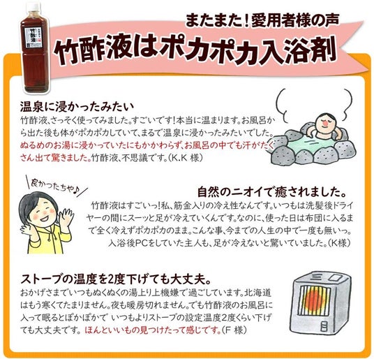スキンケアに気をつかう方にもおすすめで、お客様からは「お風呂上がりに体が温かく感じられた」、また竹酢液を入れたお湯を使って洗髪をしたところ「髪にしっとり感が出た」といったご感想も寄せられており、入浴の時間をさらに豊かにするアイテムとしてご好評をいただいています。