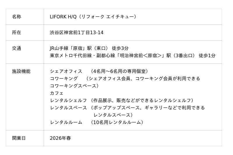このたび、2025年9月に開業した複合商業施設「原宿クエスト」(東京都渋谷区)の4階に、クリエイター向けシェアオフィス・コワーキングスペースなどを備える『LIFORK H/Q(リフォーク エイチキュー)』(以下「本施設」)を2026年春にオープンすることをお知らせします。