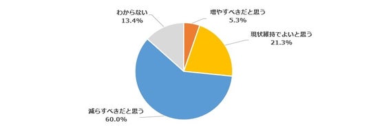 自民・維新の連立政権合意書は、衆議院議員の定数(465)について一割削減を目標に、現在開会中の臨時国会に議員立法で法案を提出し、成立を目指すとした。衆院議員の定数について、どうすべきだと思うか聞くと、「減らすべきだと思う」が60.0%に上り、「現状維持でよいと思う」21.3%、「増やすべきだと思う」5.3%となった。「わからない」は13.4%。