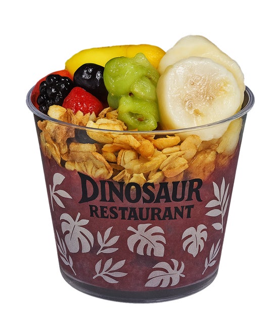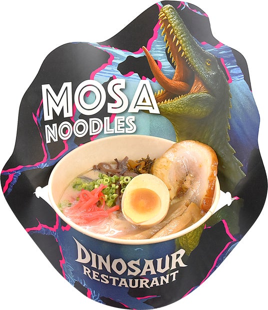 さらにメニューは、ハンバーガー「T-REXバーガー」、「油そばウルス」、「トリケラタコス」はじめ、スーパーフードのアサイーを使ったデザート「ジュライー」、骨付きターキーに豪快にかぶりつく「ダイナレッグ」など、恐竜をイメージしたユニークなラインナップに一新しました。また食器も、リアルな恐竜のイラストが付いたテイクアウト可能な素材に替え、恐竜に囲まれたレストラン内はもちろん、昼は秋空のもとピクニックのように外で食べ、夜はイルミネーションの世界に浸りながら食べ歩くことも可能になりました。