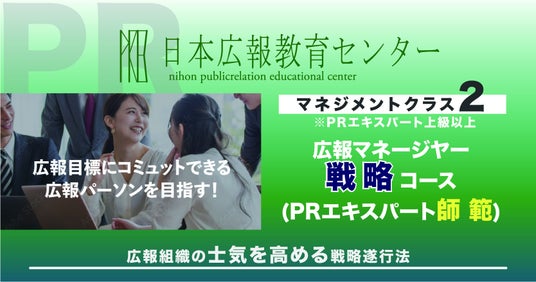 広報マネージャーコース2「戦略編」(PRエキスパート・師範)は現場を率いる広報部門の責任者である広報マネージャーが、部門全体の成果を最大限に高めるために必要不可欠となる広報戦略の立案とその実行方法を学ぶ講座です。