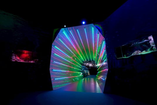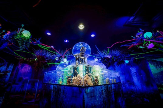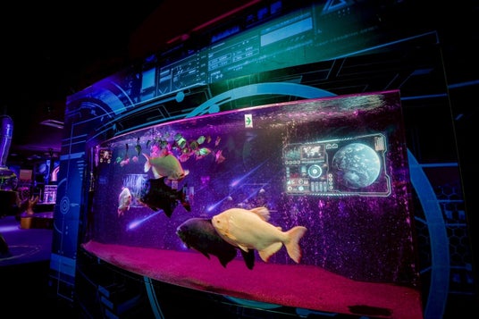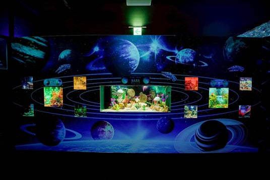 本施設は、“宇宙を旅するアクアリウム”をテーマにした没入型の展示で、来場者は“宇宙船の乗客”となり、出発から帰還までのプロセスを体験します。光・音・映像・香りと、生きた水生生物を組み合わせることで、フィクションと現実が重なる独特の臨場感を生み出します。