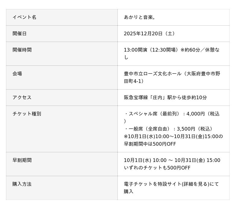 老舗キャンドルメーカーのペガサスキャンドル株式会社(本社:岡山県倉敷市、代表者:井上功郎)は、キャンドルの灯りとヴァイオリンの生演奏が織りなす幻想的なコンサート「あかりと音楽。」を、2025年12月20日(土)に大阪・豊中市立ローズ文化ホールにて開催いたします。本イベントはこれまで岡山・倉敷を中心に開催してきましたが、今回が初の大阪開催となります。