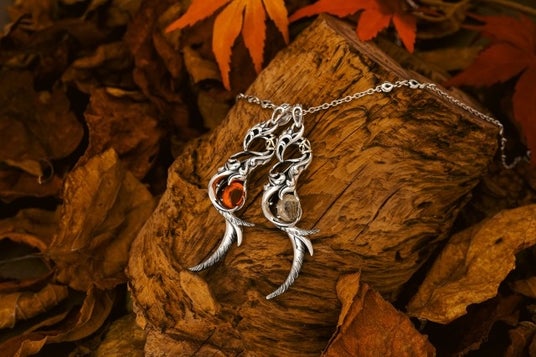 左:朱雀ペンダントw/ロードライトガーネット¥93,500(税込) 右:朱雀ペンダントw/ゴールデンルチル・ゴールデンダイヤモンド¥60,500(税込) ※チェーンは別売りです。