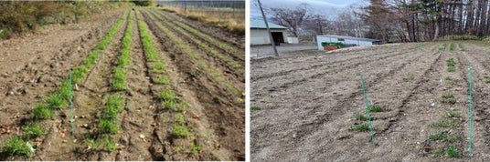 左:秋に播種した時の様子 右:春の雪解け後の様子
