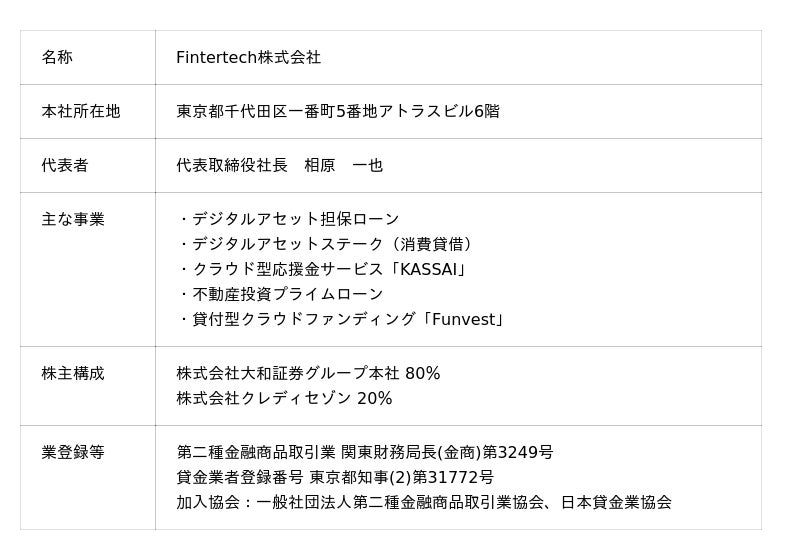 Fintertechは、大和証券グループ及びクレディセゾンがそれぞれ創業来培ってきた金融ビジネスのノウハウを礎としながら、最先端のテクノロジーの活用や外部企業との連携により次世代金融サービスを機動的にかつ柔軟に創出することを目指しています。 主な事業として、暗号資産を活用した「デジタルアセット担保ローン」及び「デジタルアセットステーク(消費貸借)」、クラウド型応援金サービスの「KASSAI」、「未来をわかちあう投資」を提供する貸付型クラウドファンディングサービス「Funvest(ファンベスト)」を展開しています。