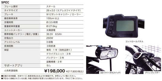 - 太陽誘電「FEREMO(TM)」回生システム搭載(ブレーキや惰性走行中に発電し、長距離走行を実現)