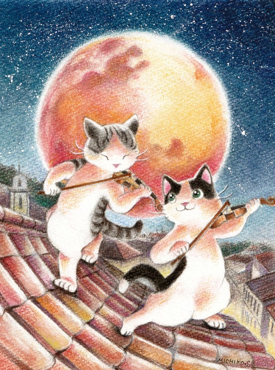 [猫と音楽 Strings Cats]パステル画「赤い月の夜」(30.2×24.8cm) 38,500円