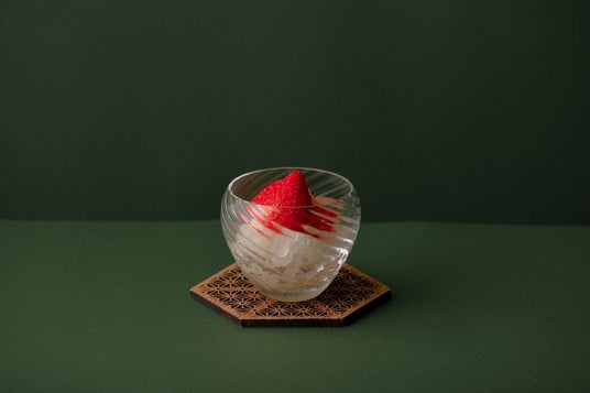 シャンパンのシロップを凍らせて、繊細できめ細やかな氷の触感をお楽しみいただくためにペストリーシェフが手作業で丁寧に削った氷に、瑞々しい甘さと酸味をもつ京都産いちごを贅沢に使い、シャンパンの華やかな香りがひろがるグラニテに仕上げました。