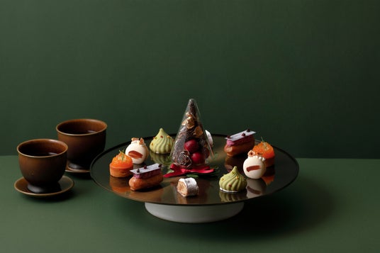 華やかなローズが香るスパークリングティーから始まるフェスティブアフタヌーンティーは、冬の恵みを繊細に表現したセイボリーから、季節の果実やスパイスが彩るスイーツアソートまで、コース仕立てで展開されます。香ばしい玄米茶や力強い紅茶、そして月桃やアマチャ、ゆずなどを用いた和のハーブティーが、それぞれの味わいに寄り添いながら、各メニューの食後感を昇華させます。