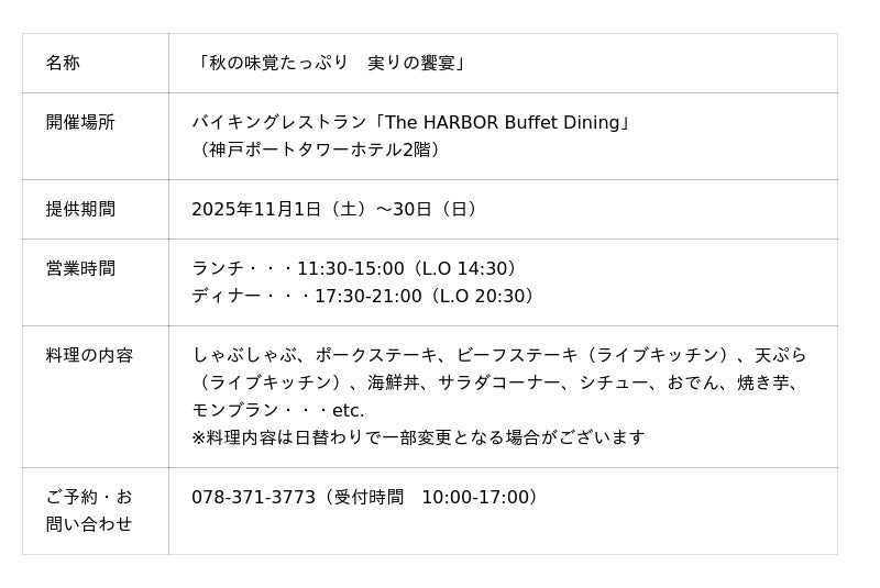 株式会社アベストコーポレーション(代表取締役:松山 みさお)が運営する神戸ポートタワーホテル(支配人:薩摩 利幸、兵庫県神戸市中央区)は、バイキングレストラン「The HARBOR Buffet Dining(ザ・ハーバー ビュッフェダイニング)」にて、2025年11月1日(土)から30日(日)まで、「秋の味覚たっぷり 実りの饗宴」を開催いたします。