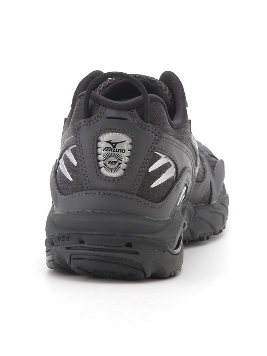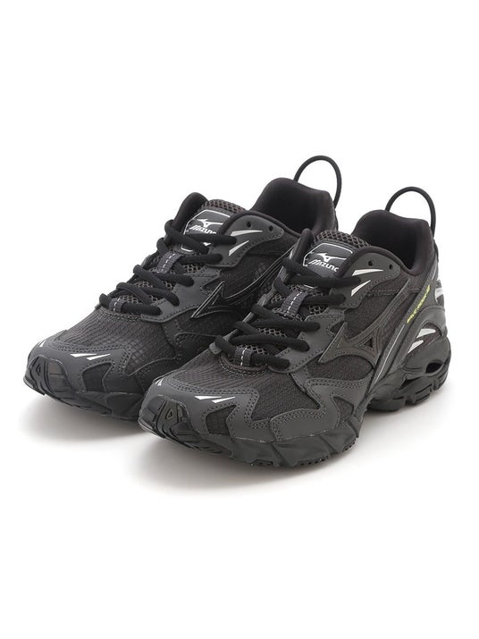 ミズノの「WAVE RIDER 10」をブラックのワントーンで透け感のあるメッシュアッパーに。ヒールには、WAVE RIDER 10とemmi10周年をかけあわせた10ロゴをデザインし、Wネームを配したスペシャルな一足。左右非対称のインソールやシルバーのヒールパーツ、イエローのサイドロゴなど、モードさの中に遊び心を加えました。