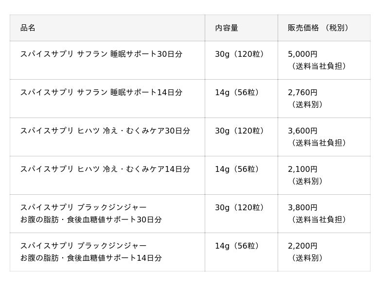 機能性表示食品 スパイスサプリ(通販限定)「サフラン 睡眠サポート」「ヒハツ 冷え・むくみケア」10月28日 リフレッシュ「ブラックジンジャー お腹の脂肪・食後血糖値サポート」10月28日 新発売