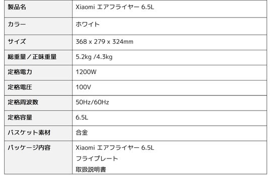 ■Xiaomi エアフライヤー 6.5Lのスペック概要