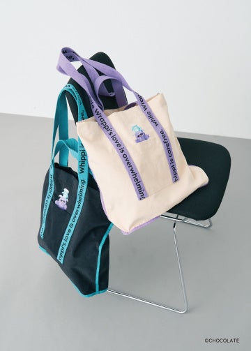 雑貨アイテムでは、ホイッピとラッピのフェイスをモチーフにしたポーチが登場。SNSでおなじみの“好きすぎて食べちゃう”ラッピの大きな口の中にあるハートマークや、ホイッピの可愛いしっぽも再現し、細部までこだわりました。そのほかポケットから2人が顔をのぞかせるトートバッグと、本コラボ限定のクリエイティブを使用したアクリルキーホルダーもラインアップしております。