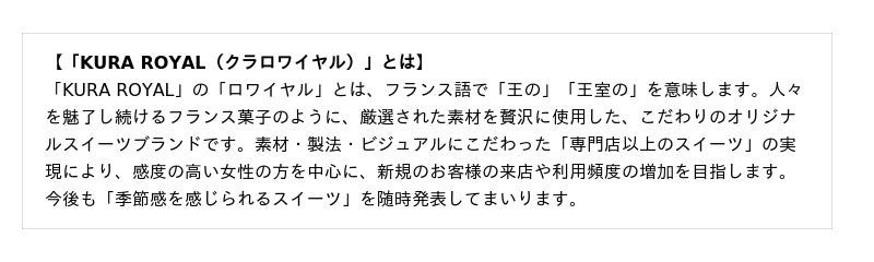 その他、“専門店以上のスイーツ”を目指し、素材や製法、ビジュアルにもこだわったスイーツブランド「KURA ROYAL」から、新作「NYストロベリーチーズケーキパフェ」が登場。ザクザクとしたクランブルやジューシーないちごクリームをぎっしり詰め込んだNYスタイルのパフェです。トッピングのチーズケーキは、オーストラリア産のクリームチーズを使用。濃厚でなめらかな口当たりになるよう、低温でじっくりと焼き上げており、敷いているクッキー生地は二度焼きすることで、サクサク食感が残るように仕上げています。容器には、マスカルポーネチーズを使用したクリーミーなクリーム、果肉感のあるいちごクリーム、酸味のあるベリーソース、ザクザク食感のブラックココアビスケット、クランブルを層にして詰め込むことで、さまざまな味わいや食感が同時にお楽しみいただけます。