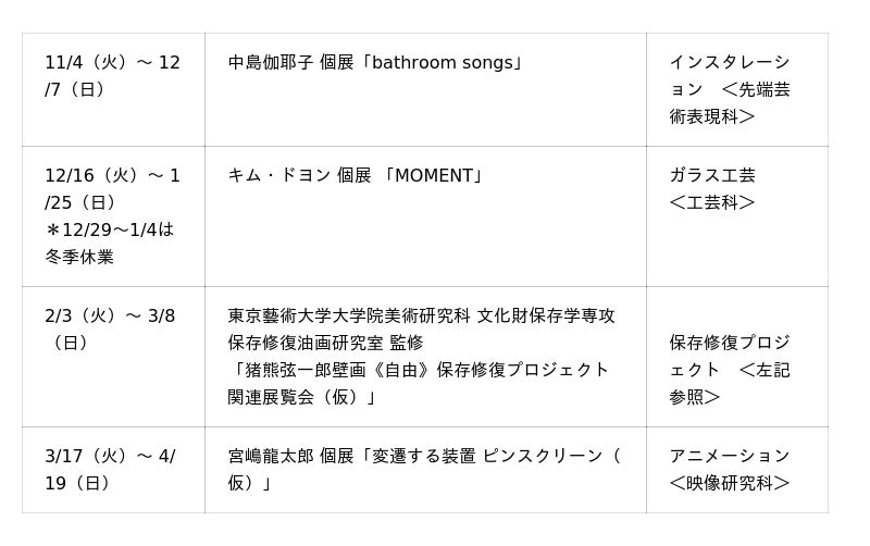 コミュニケーションの非対称性やズレをテーマに、物事を隔てる「壁」をモチーフに制作を続ける中島伽耶子の個展「bathroom songs」を皮切りに、茨城県取手市を拠点にガラス作家として活動するキム・ドヨン、JR上野駅中央改札口にて現在進行中の猪熊弦一郎氏が描いた大型壁画《自由》の保存修復プロジェクトに関する展示、そしてアニメーション装置〈ピンスクリーン〉を用いた宮嶋龍太郎の個展を順次開催いたします。2025年度後半も、“es”は多様な表現を通して、創造と出会いの場をひらいていきます。