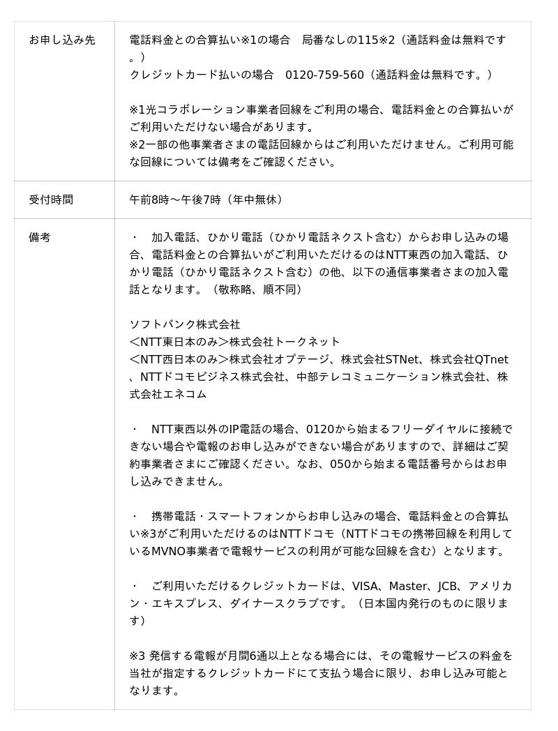※4 一部の他事業者さまの電話回線からはご利用いただけません。詳細は別添「電報のお申し込み方法について」をご参照ください。