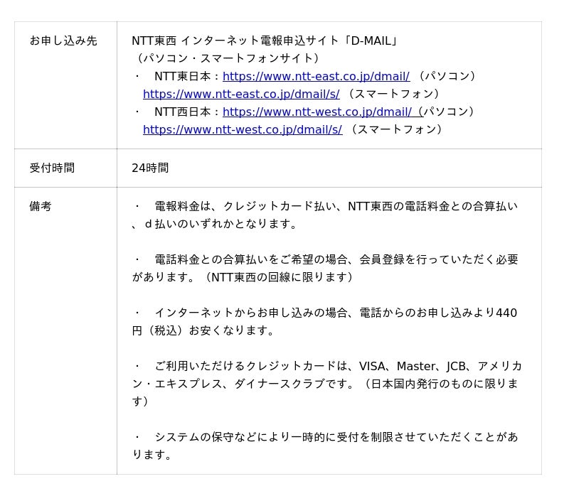 NTT東西のインターネット電報申込サイト「D-MAIL」