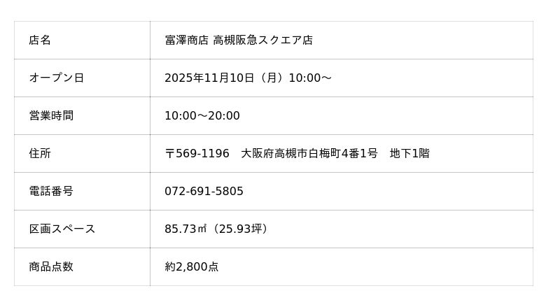 日本最大級の製菓・製パン材料、器具専門店として創業106年の株式会社富澤商店は、2025年11月10日(月)に「富澤商店 高槻阪急スクエア店」をオープンいたします。高槻市内では初出店となる同店は、JR高槻駅からペデストリアンデッキを渡ってすぐの「高槻阪急スクエア」地下1階に位置し、製菓・製パン材料など約2,800点の商品を取り揃えます。オープンを記念して、11月10 日(月)~11月16日(日)の7日間限定で、数量限定のお楽しみ袋や、大人気ペーストシリーズを特別価格で販売いたします。