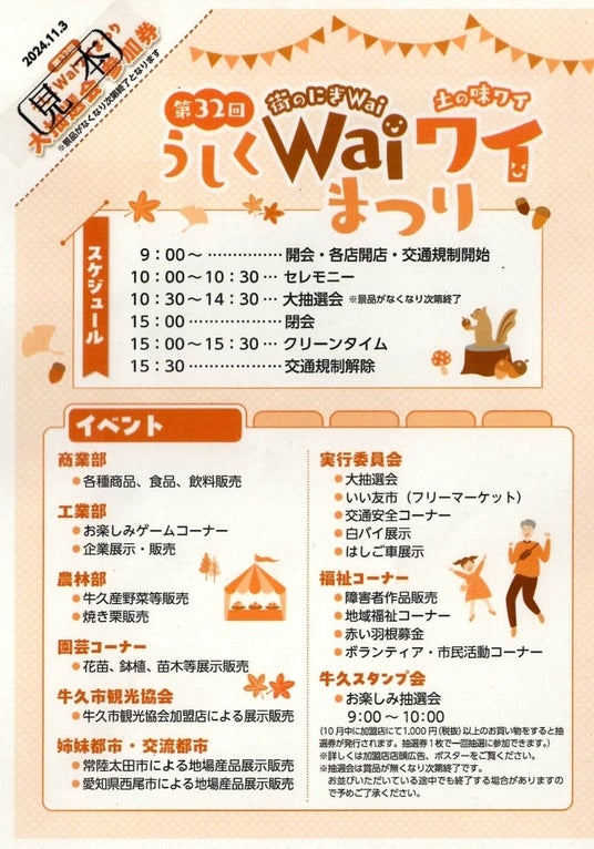 イベント名:第32回うしくワイワイまつり日時:2025年11月3日(月・祝)9:00~15:00
