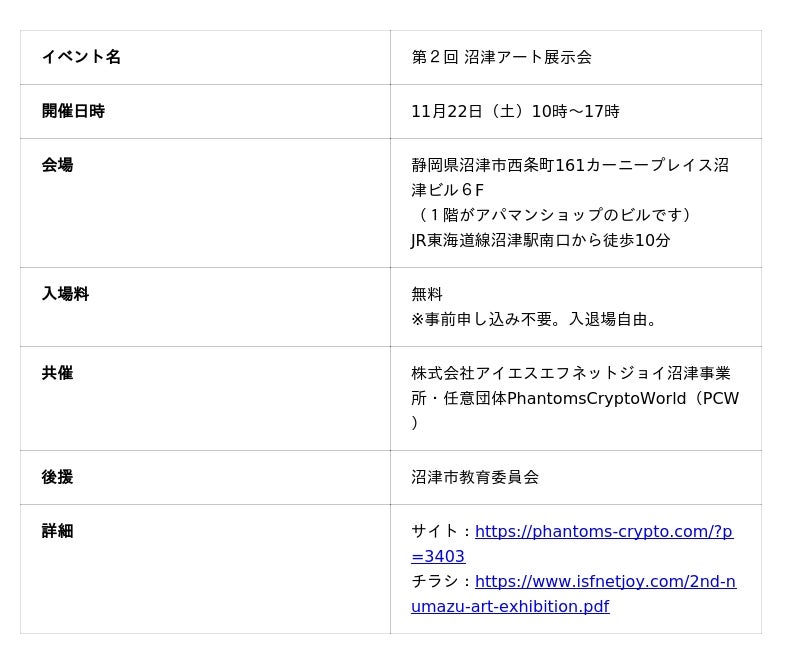 アイエスエフネットジョイはPhantomsCryptoWorldと共催で第2回沼津アート展示会を開催いたします