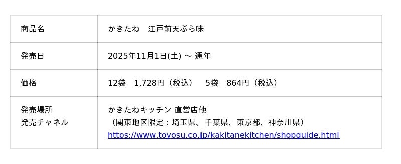 とよす株式会社(本社:大阪府池田市 社長:眞田 昌彦)は、百貨店を中心に展開しているブランド「かきたねキッチン」において、さらに美味しく進化した『かきたね 江戸前天ぷら味 12袋』と新たに『かきたね 江戸前天ぷら味 5袋』を加え、2025年11月1日(土)から関東地区限定で発売いたします。