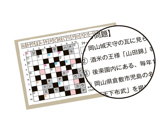 周遊スポットを巡り、「岡山市の歴史」、「室町~江戸時代」、「秀吉」、「宇喜多家」等に関する問題を解くクロスワードラリーです。クロスワードが解けた人は、抽選で10名に岡山県産米「きぬむすめ」10kgが当たるキャンペーンに応募できます。