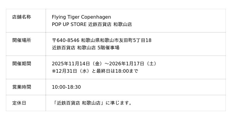 北欧デンマーク・コペンハーゲンで誕生し、ヨーロッパを中心に世界中に店舗を展開するユニークなデザイン雑貨ストア Flying Tiger Copenhagen(運営:Zebra Japan株式会社/本社:東京都渋谷区神宮前/代表取締役:松山恭子)(略称「フライングタイガー」)は、2025年11月14日(金)より、和歌山県和歌山市の百貨店「近鉄百貨店 和歌山店」の5階催事場にて、大好評だった昨年(※2024年11月15(金)~2025年1月19日(日)実施)に続き、期間限定のPOP UP STOREを開催します。今回の催事を通して、ブランド未体験の方にも、Flying Tiger Copenhagenらしい楽しいショッピング・エクスペリエンスをご提供していきます。