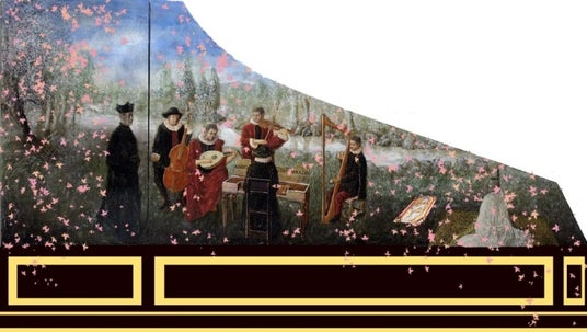 ▲ 施設に常設するチェンバロの装飾(画:馬淵哲)。天正遣欧少年使節団が西洋音楽を日本に初めて紹介した歴史的な場面が描かれています。右端には豊臣秀吉の姿も見えます。かつて彼らが新しい文化の扉を開いたように、この場所から、これまでにない新しい芸術や面白い取り組みが次々と生まれてほしいと願っています。